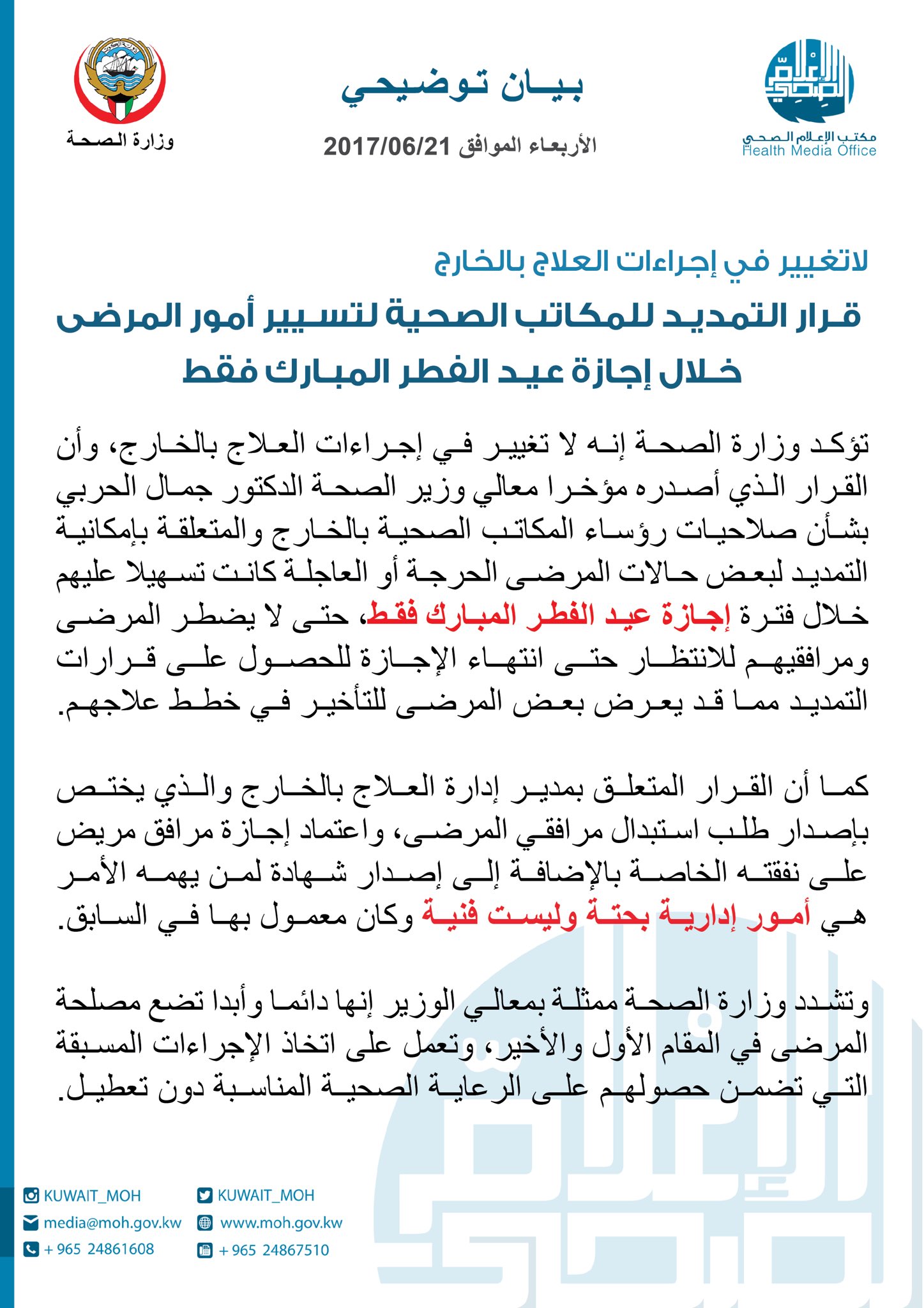 وزارة الصحة الكويت Pa Twitter بيان توضيحي لاتغيير في إجراءات العلاج بالخارج قرار التمديد للمكاتب الصحية لتسيير أمور المرضى خلال إجازة عيد الفطر المبارك فقط Https T Co Dhf2w2iurh