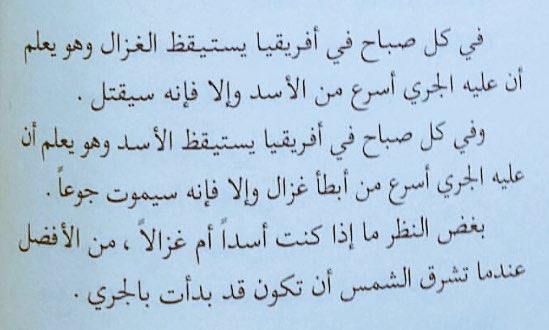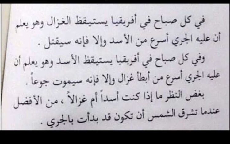 في كل صباح في أفريقيا يستيقظ غزال يدرك أنه يجب أن يعدو بخطوات أسرع من خطوات الأسود وإلا كان الموت مصيره وفي كل صباح في أفريقيا يستيقظ أسد يدرك أنه يجب أن