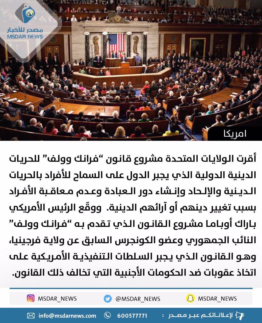 فواز البرازي A Twitter تم اقرار قانون فرانك وولف الأمريكي والذي يعاقب الدول التي لا تسمح للأفراد بحرية الإعتقاد من الوثنية إلى الإلحاد أو لا تسمح لهم بحرية تغيير اعتقاداتهم أو انشاء
