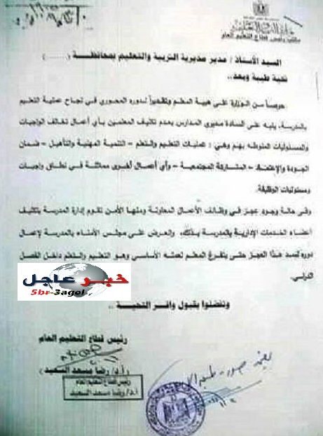 فاكس عدم تكليف المعلم بأي اعمال بخلاف التدريس وفي حالة العجز تكليف هذه الفئة