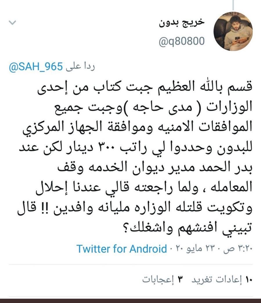 بدر راشد البغيلي على تويتر بدعوة من السيد العم صالح الفضاله تم الاثبات بالمستندات و الاوراق الرسميه خطة هذا الجهاز وتعامله مع القضيه بكل شفافيه و انسانيه بأن الجهاز لم يظلم احد والدليل منحهم