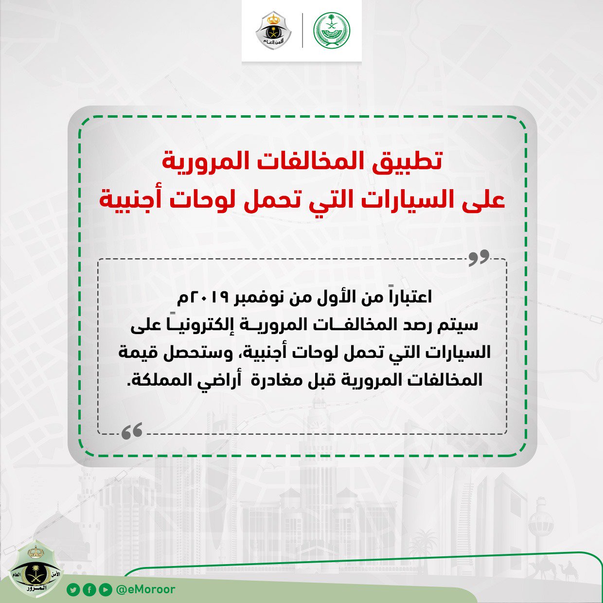 المرور السعودي On Twitter تطبيق المخالفات المرورية على السيارات التي تحمل لوحات أجنبية اعتبارا من الأول من نوفمبر ٢٠١٩م سيتم رصد المخالفات المرورية إلكتروني ا على السيارات التي تحمل لوحات أجنبية وستحصل قيمة