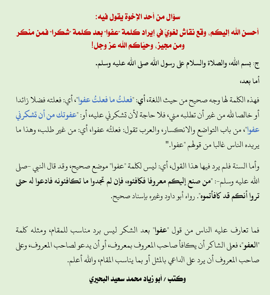 موقع أبي زياد محمد بن سعيد البحيري حكم قول كلمة عفوا بعد الشكر